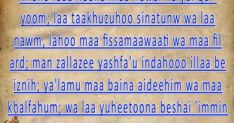 Surah 2:255 Bismillaah ar-Rahman ar-Raheem Allahu la illaha illa hu Wal Hayyul Qayyum La te huzuhu sinetun wala nawmun Lahu ma fissemawati wa ma fil’ardi Men thallathiy yeshfe’u indehu illa biznih Ya’lemu ma beyne eydiyhim wa ma halfehum wa la yuhiytune bishey’in min ilmihi illa bima sha-a wasia kursiyyuhu semavati wal’ard Wa la yeuduhu hifzuhuma wa hu wal aliy ul aziym Saddaqallah hul Azim In the name of Allah, the Beneficent, the Merciful. There is no God but He, the Living, the Self-subsisting, the Eternal. No slumber can seize Him, nor sleep. All things in heaven and earth are His.